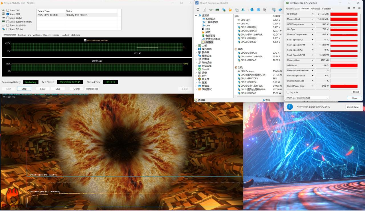 用AIDA 64的FPU让处理器满载,在用FurMark让显卡满载,烤机10多分钟如上。供电方面,CPU能维持在155W以上,稳!而FurMark也4080满功耗运行在310-320W,贴着显卡的TDP,性能释放稳稳的。整机的散热压力不算大,而且电源噪音也几乎被散热器噪音压制了,总体还是很安静的。