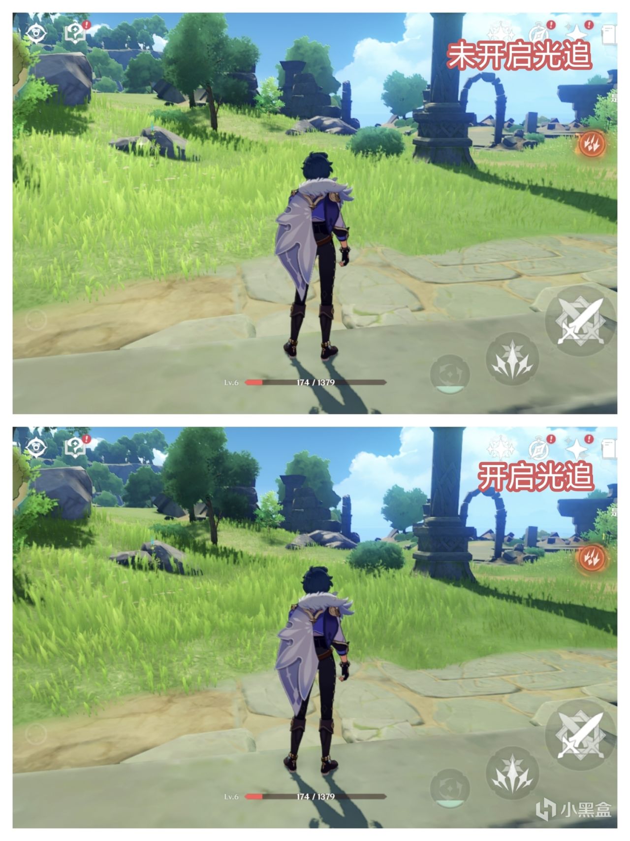 而且得益于自研电竞芯片Q3+QNSS超级渲染引擎,这次全场景光追直接安排上,开启后你可以看到角色站位的地面和草丛反射出来的光影,有光线追踪要更真实。