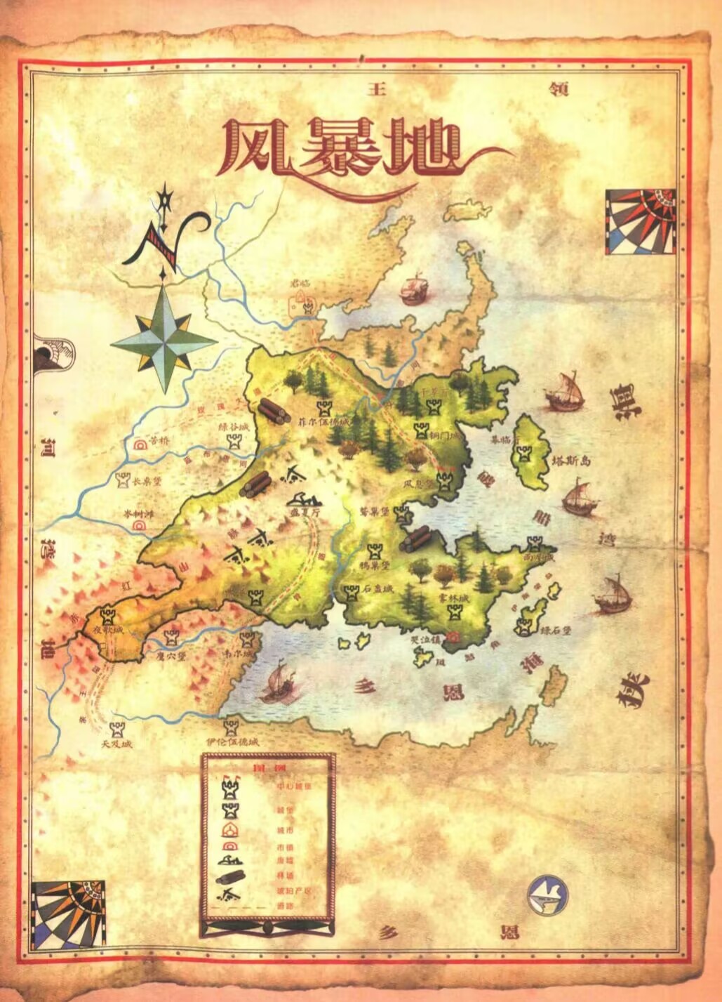 破船灣外的大島塔斯島以瀑布、湖泊和巍峨山峯而聞名,它也被認爲是風暴地的一部分,風暴地還包括伊斯蒙島及風怒角和哭泣鎮周圍數不清的小島。 風怒角以西是層密疊峯、直逼雲霄的羣山, 一路綿延直至接入分割風暴地和多恩領的赤紅山脈。赤紅山脈 多爲幹調深邃的峽谷與巨大的砂岩峭壁,日落時分在雲層映襯下,山峯有時真的會閃耀着深淺不一的紅色,但也有人說,山脈名稱並非源於石頭的顏色,而是土地中浸染的鮮血。