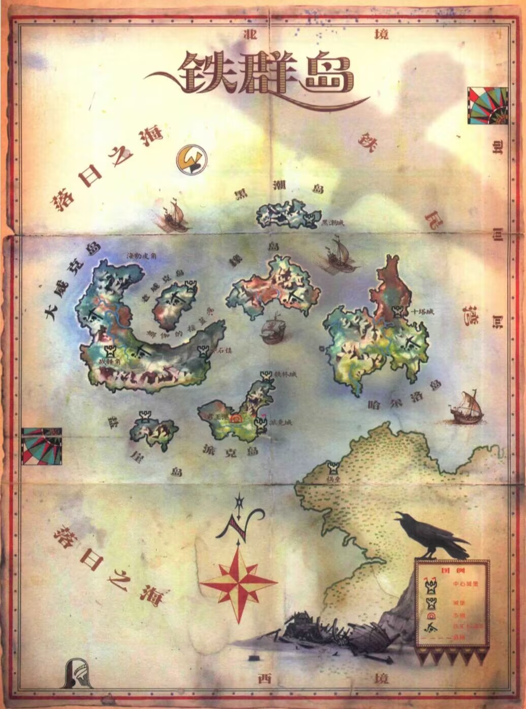 哈爾洛島在羣島中人口最多;大威克島最大、鐵礦最豐富;老威克島最神聖,海鹽王和磐巖王會聚集到這裏古老的“灰海王”大廳中決定鐵羣島最高統治者;橡島多山崎蜒,是若干世紀前葛雷艾恩家族的鐵國王們的大本營;派克島有羣島最大的市鎮君王港,也是自伊耿征服以來統治羣島的葛雷喬伊家族的地盤;黑潮島和鹽崖島較偏僻。自主島鏈朝西北方向的落日之海航行八日,可達另一島羣。那些風暴肆虐的巖島一個比一個小,只有海豹和海獅在上面築巢,加起來也幾乎無法支撐一座城堡。 最大的巖島上有法溫家族的堡壘,號孤燈堡,因堡頂烽火日夜不息。