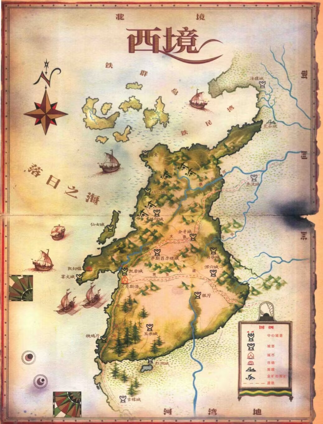 西境氣候溫和,適合作物生長,它東、南兩面有高山屏障,西方是蔚藍無盡的落日之海。在黎 明紀元,這裏的森林曾是森林之子的家園,巨人則居住在山丘間,其骨骸仍不時被髮掘出來。後來先民用烈火 和青銅斧摧殘森林、開星翠田,並在巨人居住的羣山間開闢道路。傳說告訴我們,那段時間西境的戰爭非常殘酷,許多英雄慘死於上古種族之手,但人類前仆後繼直到“從鹽水到石山” ,整個西境遍佈農場和村莊。它們起初由低矮的柵欄與砌堡保護,後來是雄偉的石頭城堡。於是巨人漸漸失蹤,森林之子也消失在森林深處空山幽谷或更遙遠的北方。