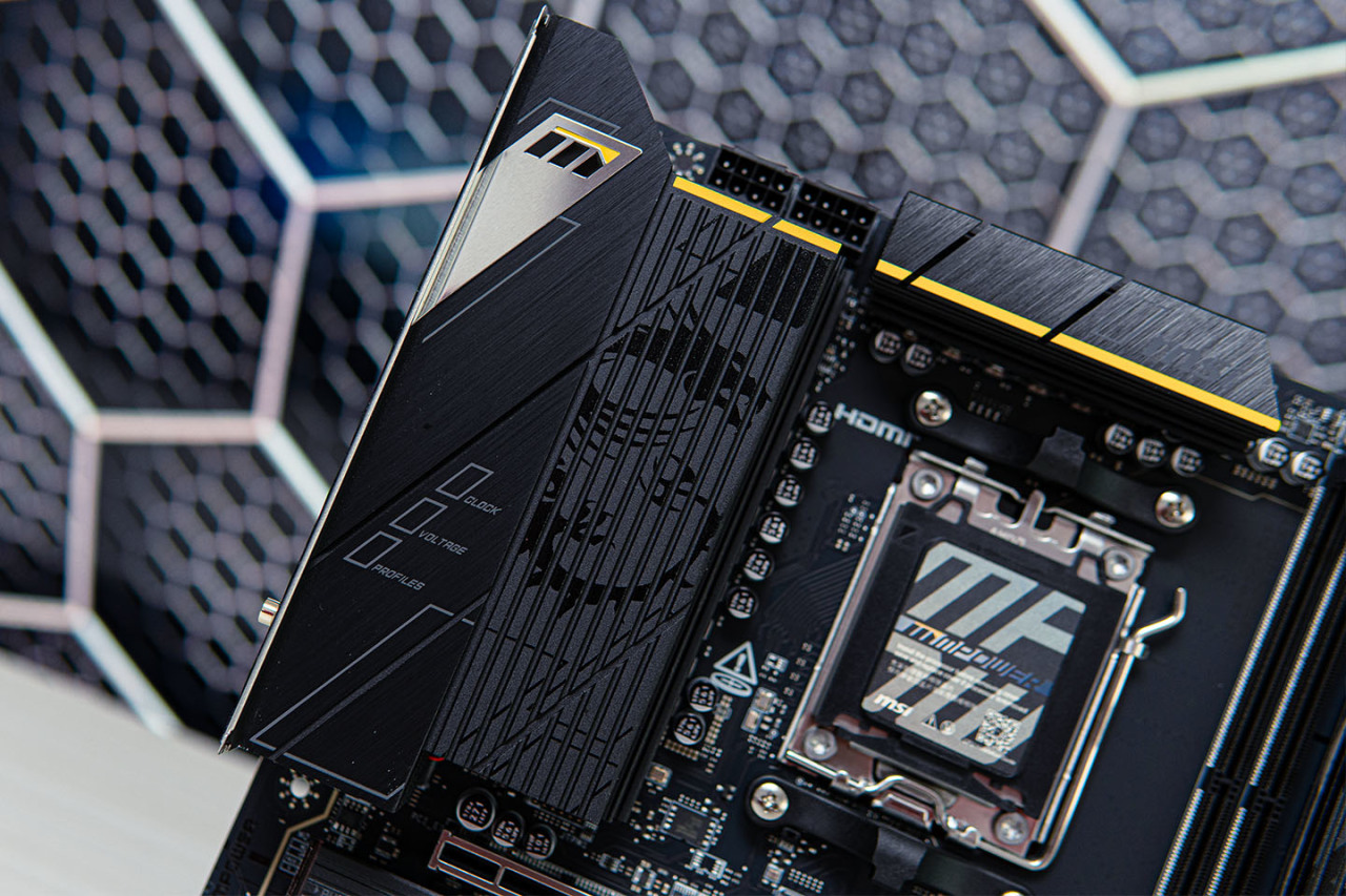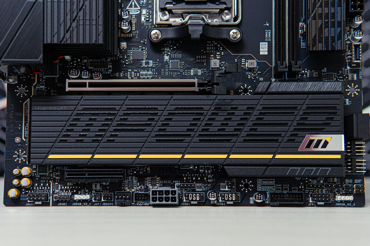 微星B850MPOWER主板双内存条设计把空出位置留给了M2固态,正面三个固态位分别支持PCIe5.0*4、PCle5.0*4、PCle4.0*4,散热装甲均支持快拆,上下面已预装散热贴。