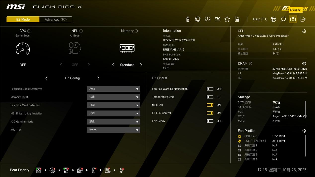 微星B850MPOWER的BIOS也做了定制主题,整体界面非常清爽,左上角可以快速开启Game Boost游戏模式、NPU AI Boost、内存EXPO,下方EZ Config有自动PBO选项、Memory Try It!预设超频选项、X3D Gaming Mode等,新机大部分需要设置的选项都可以一键开启。
