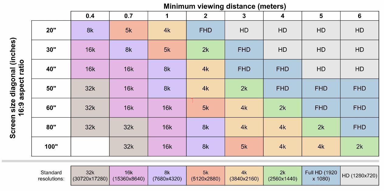 对电视游戏玩家而言,在3米观看距离下,50英寸屏幕的视觉极限约为1440P分辨率,超过此范围的4K/8K细节人眼无法辨识。要完全发挥4K实力需至少60英寸屏幕,5K需100英寸,而50英寸8K电视的最佳观看距离仅1米。研究指出,超出人眼极限的像素只会增加设备成本与运算负荷,却无法带来相应的体验提升。PC显示器则呈现不同情况,在40厘米视距下,30-40英寸屏幕可展现直至16K的视觉差异。