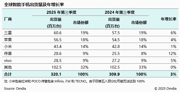 数据显示,2025年第三季全球智能智能手机市场出货量高达3.201亿台,同比增长3%。