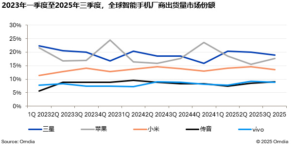 今日,市场调研机构Omdia(原Canalys)发布了2025年Q3智能手机市场报报告。