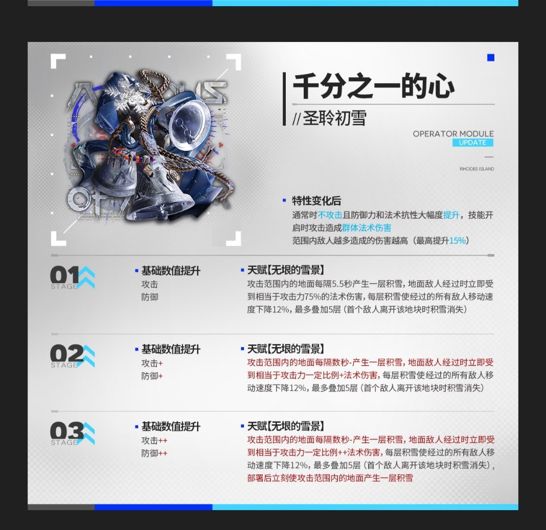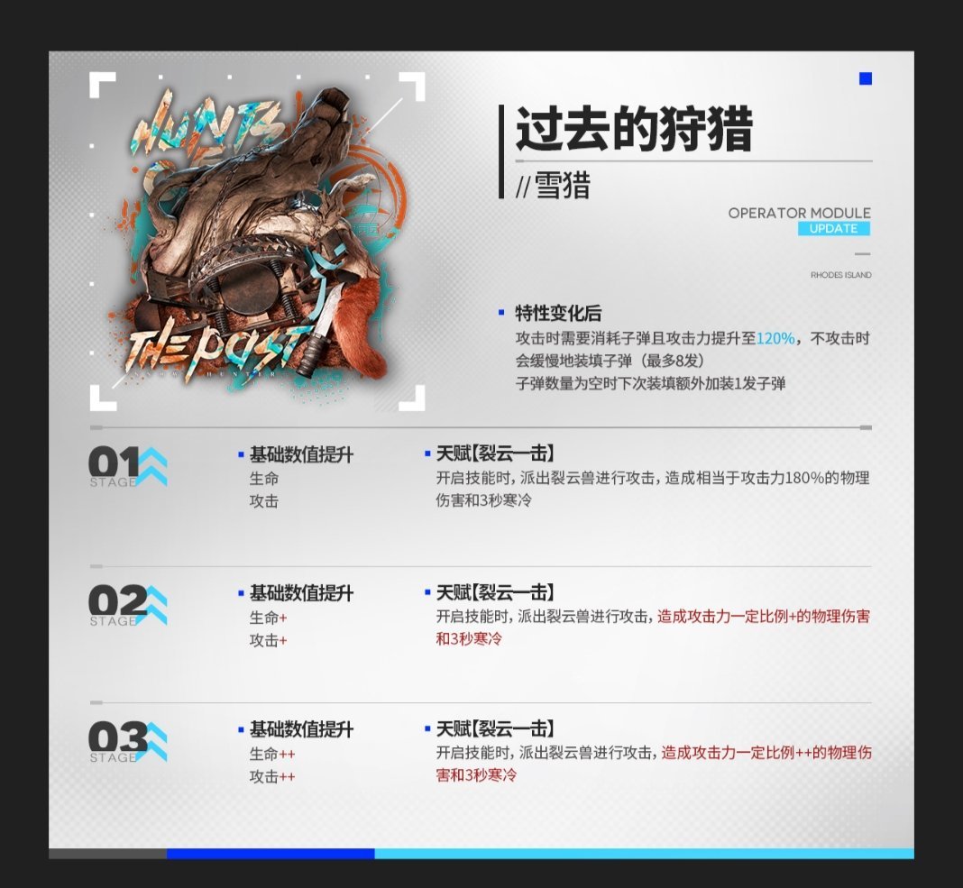 可以配合新的2个6星。异格银灰2技能回转快一点。初雪是1技能强力击。