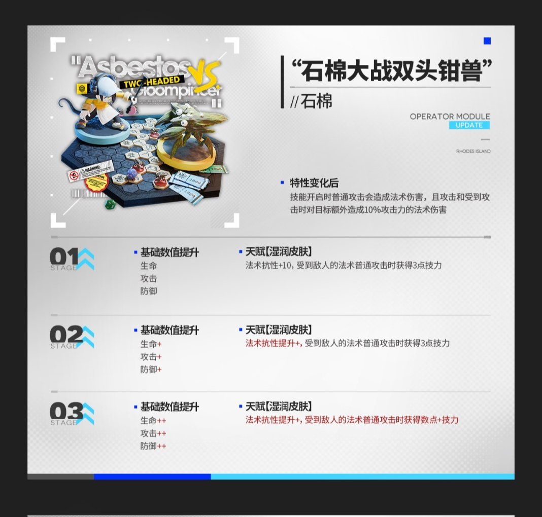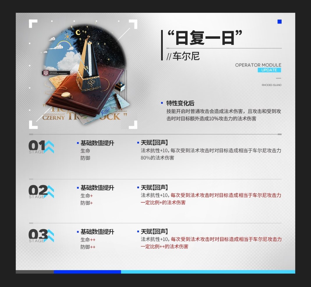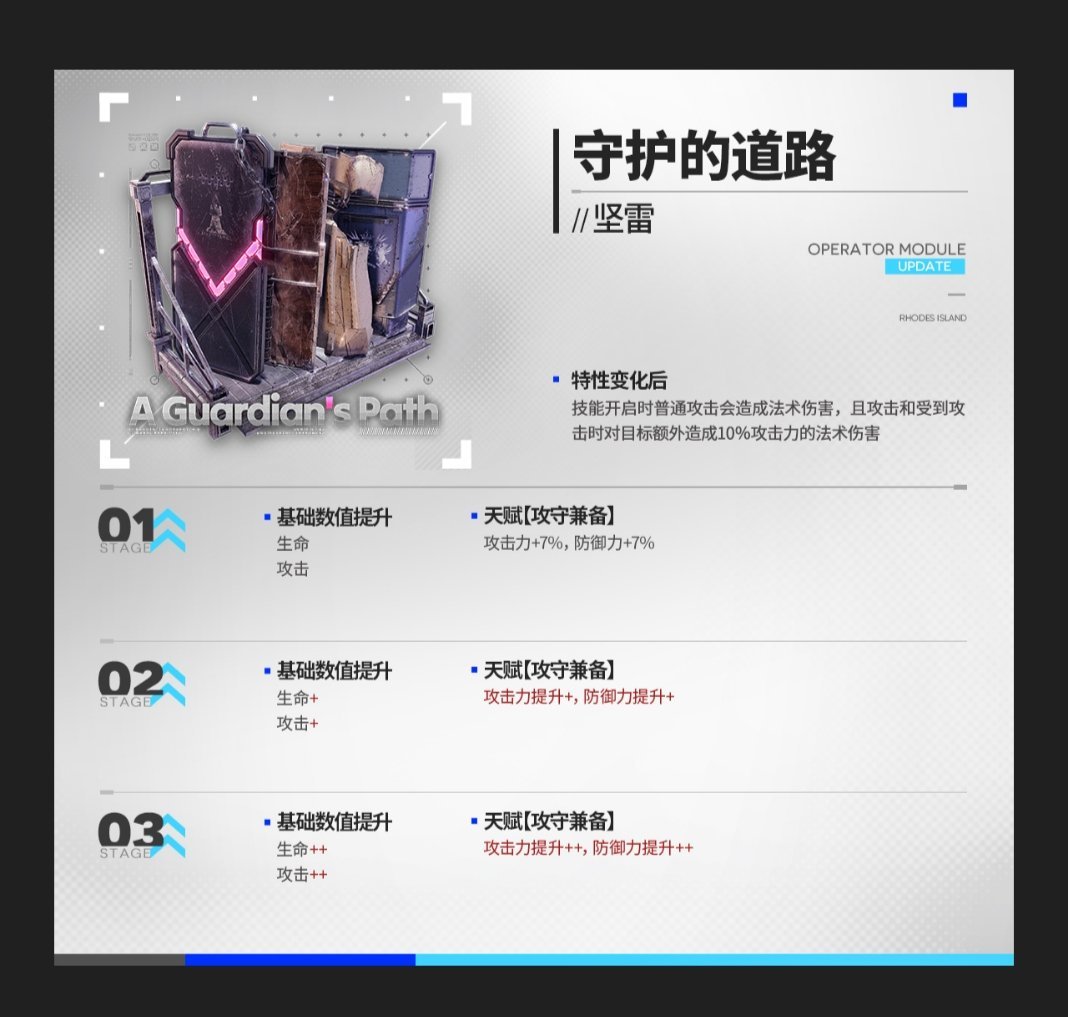 雅雅特限模组很有意思,无视10%法抗,有敌人进入目标点回30%技力。配合首次部署给临时1血盾。敌人进入蓝门浮空。刚好触发给技力。但是这样变成蓝门守卫员了。