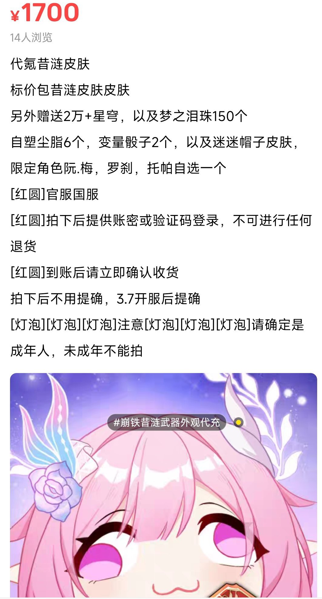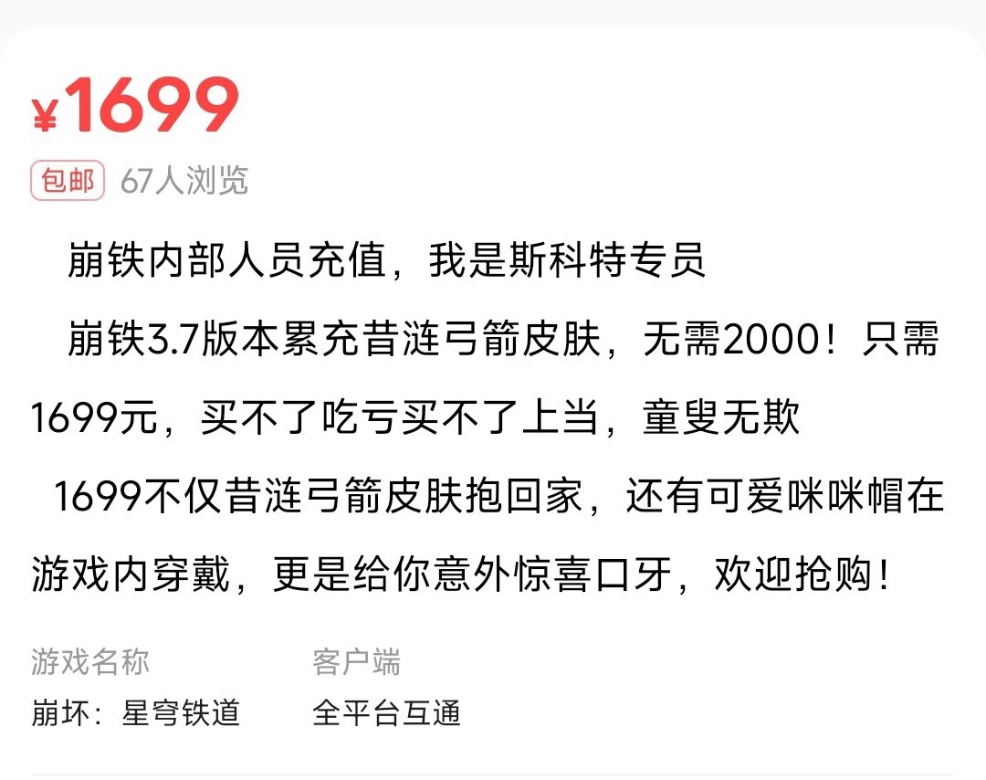 近期,闲鱼平台出现大量以《崩坏:星穹铁道》3.7版本昔涟皮肤“「∞」的誓约”为噱头的低价代购信息,标价多在1600-1700元区间,甚至有卖家以“内部人员充值”“额外赠送限定道具”等话术诱导交易。