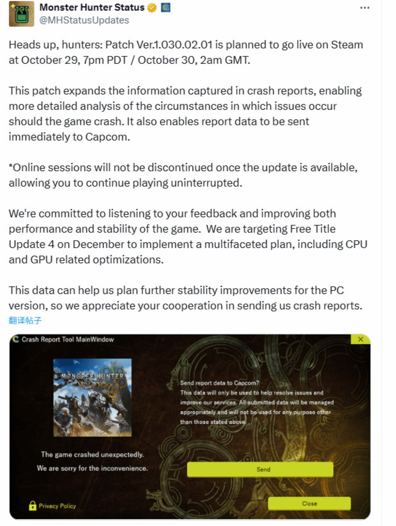 此次更新着重擴展了崩潰報告的信息捕獲範圍,使開發團隊能更精確地分析遊戲崩潰時的具體情況。補丁還新增了立即將報告數據發送至卡普空的功能,爲後續優化提供重要依據。官方特別說明,此次更新不會中斷玩家的在線遊戲體驗。卡普空確認,將於12月推出的第四次免費更新中實施一項多方位的性能提升方案,其中包括CPU和GPU相關的優化。這被視爲對早前承諾的PC版本性能優化的具體兌現。