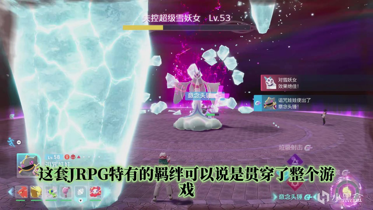 而劇情中玩家會多次跟失控Mega寶可夢對戰,形式上有點像傳阿的對王戰,不過這次不用像傳阿那樣扔鎮寶了,玩家可以直接操控寶可夢跟失控寶可夢戰鬥,而爲了強調本作Mega進化的重要性,只有Mega寶可夢才能造成高額傷害,這點倒更像是朱紫的太晶團體戰。就是大部分時候失控寶可夢的仇恨都在玩家身上,這也是造成了部分差評的原因,我印象裏我是沒失敗過,稍微有點動作功底或者能通關傳阿基本就不會有問題了。還有一個貫穿了主線的點,在絕大部分失控戰裏玩家都是有超Z隊隊友作爲助力的,這套JRPG特有的羈絆可以說是貫穿了整個遊戲。