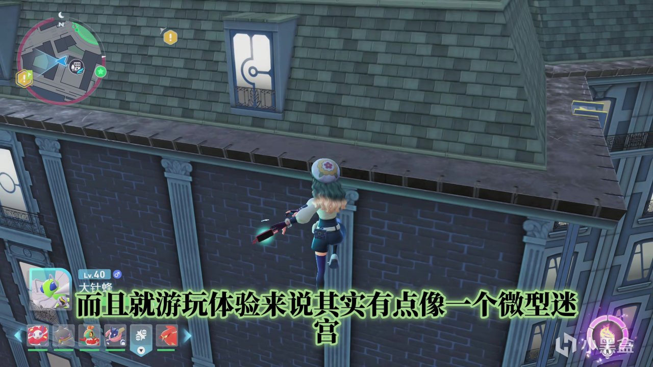 探索部分,要說比較類似的話可能比較像劍盾,畢竟沒有朱紫和傳阿的交通工具。密阿雷市雖然初看之下地圖不大,但因爲縱向內容的豐富和幾個獨立的小地圖,所以探索部分也並非完全沒有東西可玩。大部分的技能機都放在高處,呈現爲黃色精靈球,需要繞到更高處跳下獲取。攀爬腳手架的速力酷則會放置彩色螺絲作爲獎勵,收集一定數量可以去木根工程交換提高捕獲率、經驗值、金錢、超級碎片、角色血量的道具。這部分經常會用到翻滾,而且就遊玩體驗來說其實有點像一個微型迷宮,解鎖洛託姆滑翔後更是可以玩出不少花活,因爲在空中可以較大程度控制角色移動,稍微有點動作水平的玩家可以拿來逃課部分腳手架,在高樓間的移動也變得簡單許多,甚至我遊玩時也在吐槽感覺在玩刺客信條。雖然上高樓很多時候都需要繞着建築物找上去的梯子,但作爲箱庭設計的一部分,稱不上缺點,更別說全息梯用過一次後還會在地圖上標出來。