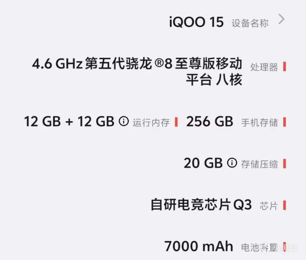 而iQOO15,采用了第五代骁龙8芯片,搭配上了电竞芯片Q3!从设备上也就算是目前手机芯片配置上的顶端了!日常使用肯定是没问题了,同时也为游戏一个好的体验感打下了基础!