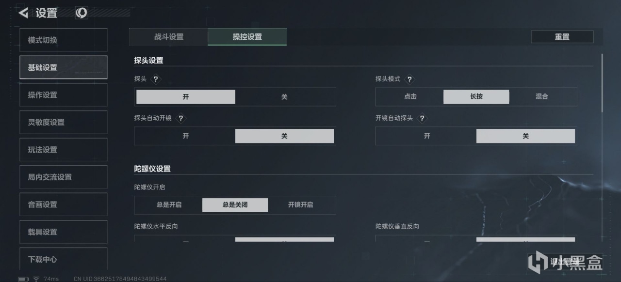 操作设置上探头一定要开的,模式选择长按,方便继续peek,不至于成为歪脖树!探头开镜就不用开了,两个按键很近可以快速的按出开镜!
