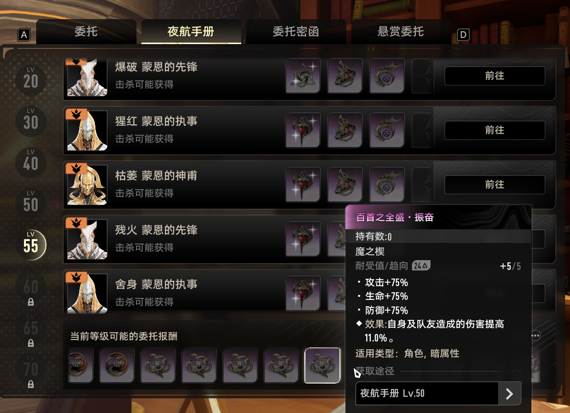 開荒期頂重要的事情自然是主線任務,隨着主線任務發展纔會逐漸解鎖模組卡以及各種功能,別以爲這是廢話,因爲最重要的是我們需要刷取的委託密函的獲取基本都在主線過程中給,沒有材料就開不了委託密函也沒辦法解鎖新角色新武器,還有高等級的紫色橙色魔之楔必須要有一定的歷練等級才能解鎖,而獲取歷練等級最快的方法就是升主線,否則只有藍色的魔之楔用直接慢人一步。