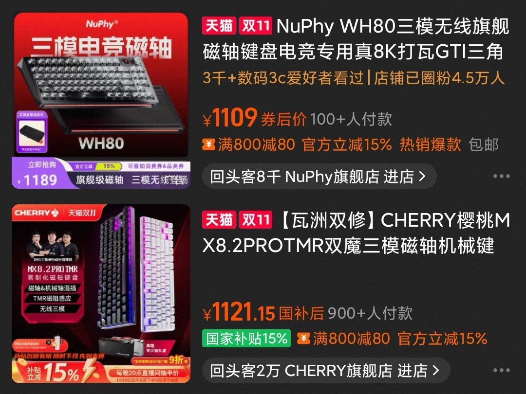 况且三模功能还会额外增加成本(上图这种真正可用的都上千了),与其为用不上的无线功能多花钱,不如把预算花在有线磁轴的轴体,键帽材质上,这样性价比反而更高了。