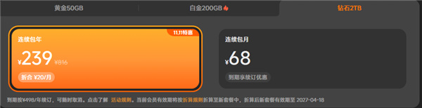 其中,50GB连续包年29元,折合每月2.5元;200GB连续包年109元,折合每月9.1元;2TB连续包年239元,折合每月20元。