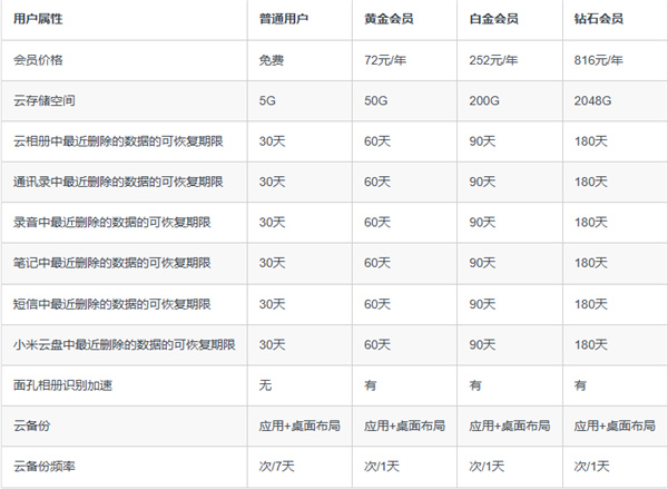 通过升级小米云服务会员,用户可在小米云服务内享受会员权益及特色服务,包括但不限于云空间扩充、备份频率提升、最近删除的数据的可恢复期限延长、面孔相册识别加速等。
