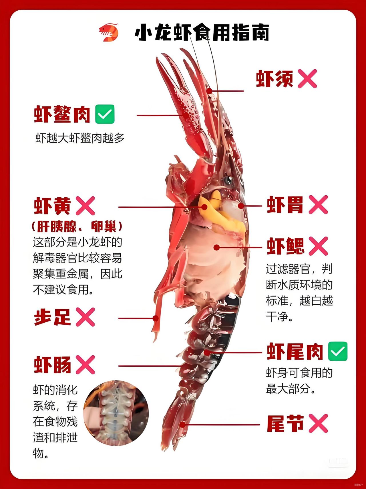 只要你不是天天吃、顿顿吃、常年吃,那么已经下肚的部分不需要惊慌,日后注意即可。不过对于儿童、孕妇、体弱者,还是尽量不要吃虾头为好。