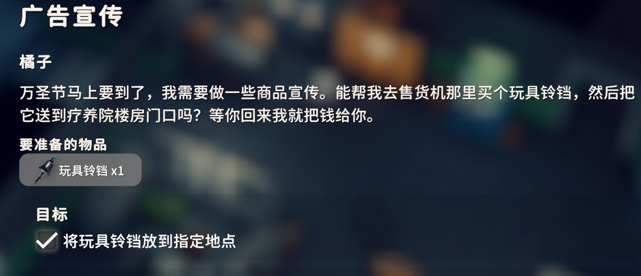 很簡單的一個任務,只需要在售貨機買一個玩具鈴鐺,帶到療養院院子裏面就行,運氣好圖裏也能摸到。小二貼一下位置座標,出來可以帶上噗噗噴,順帶找神祕商人提一波款。