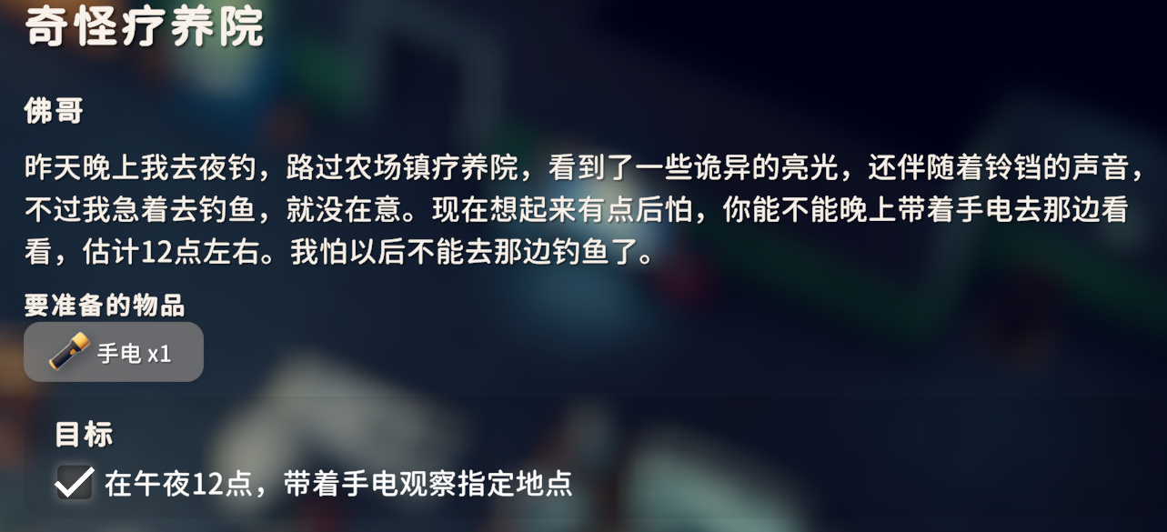 佛哥這個釣魚佬可真猛啊,管他什麼詭異的亮光,都不能耽誤釣魚。這個任務也是需要我們到療養院,不過位置是在大門,不用走進去,時間在晚上12點左右(+-30分鐘),需要帶上手電筒。