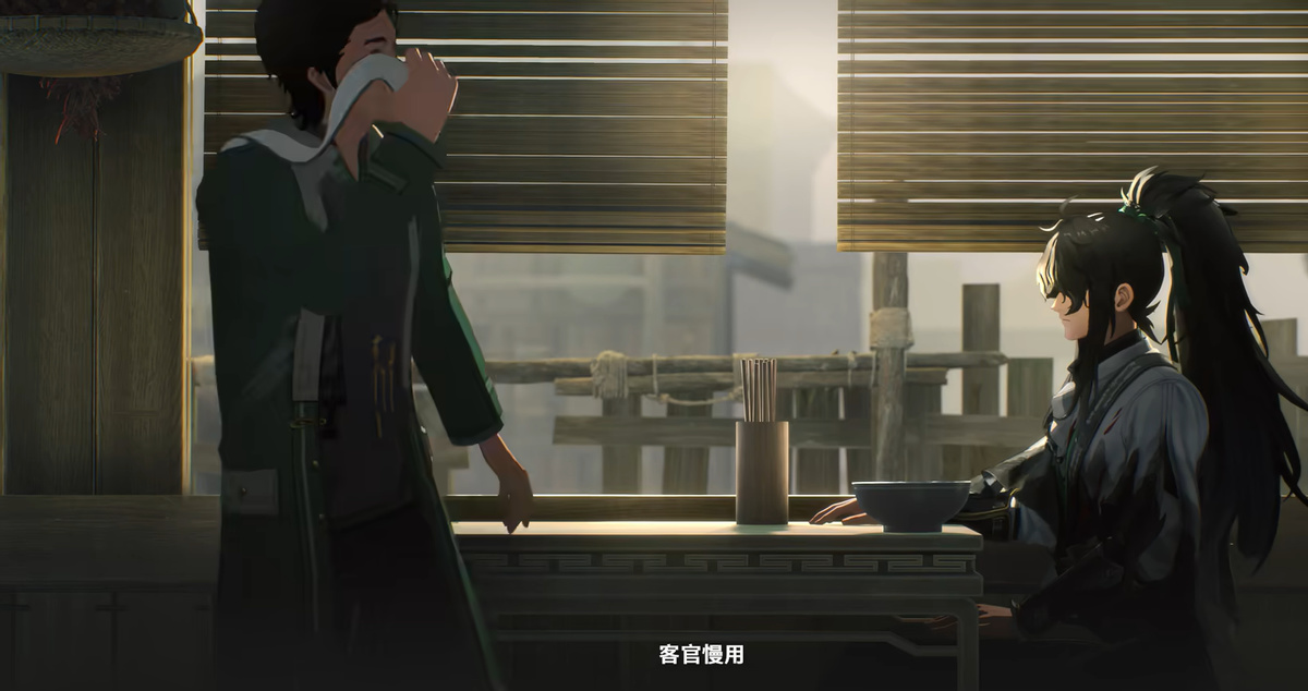 在PV里还能看到库洛各种各样的小巧思,最有意思的是嗦面这一块小二嘴里的重庆话,桌子被砸那句“天老爷啊!我的桌子!”还有一嘴一句的胎神娃娃和瓜娃子的方言太中了,再看这筷子笼,旁边挂着的红辣椒,老板不经意肩上的毛巾擦汗,瞬间让人闻到正统川渝小面馆子那个味了,尤其是这嗦完的辣面底下的红油挂壁,还有一片粘在上面的葱叶子,细节上真是给我看饿了。