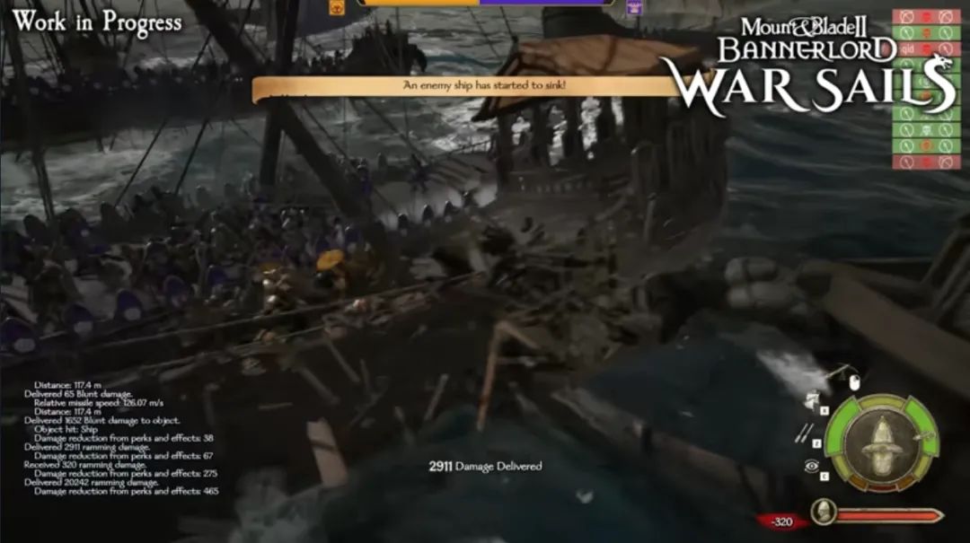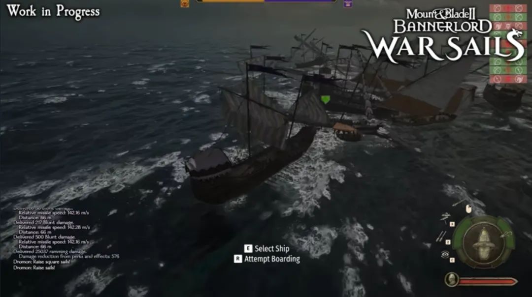 随着距离拉近,其他毁灭手段开始发挥作用。有效的冲撞仅适用于为此配备的船只,但当用于攻击受损船只时,它可以一击决定战局。角度、速度、船只重量和撞击点共同决定了造成的伤害——完美的撞击来自于快速、垂直地撞入敌船中部。船头对船头的冲突效果甚微,但干净的侧舷撞击可以压碎船壳板、直接杀死附近船员、或将士兵震倒在甲板上。一次完美的撞击,其冲击力可以震动整艘船并动摇部队的士气。