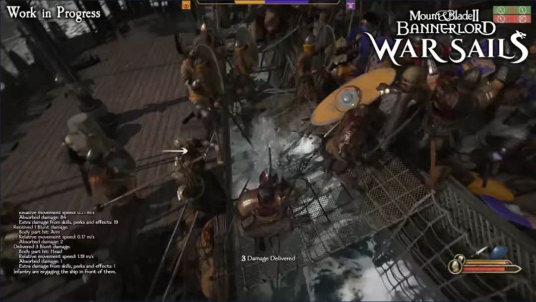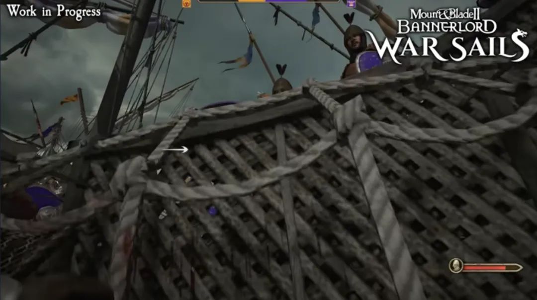 单位在战斗中途不会从桥上滑落,除非桥被切断,但玩家可以掉落或跳下。即便如此,也并非全无希望——你可以游泳、潜水,并利用每艘船携带的攀爬网爬回船上。然而,AI士兵只能游泳有限的时间。他们的游泳耐力取决于等级、水手背景和盔甲重量——一旦耐力耗尽,他们开始受到伤害并最终溺水。当一艘船沉没时,幸存船员会尝试游向最近的友方甲板,在被大海吞没前挣扎求生。