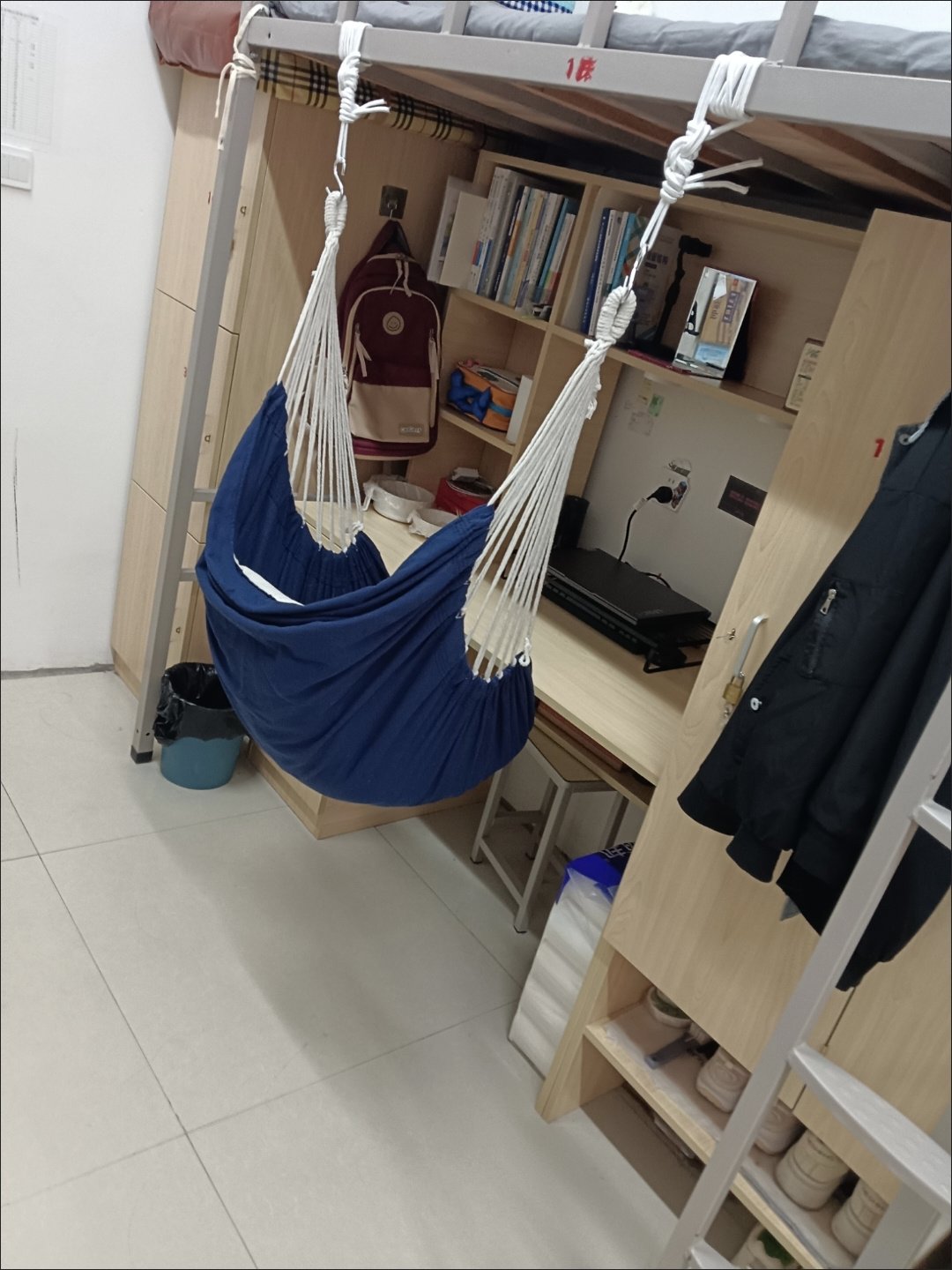 这个吊床坐到大二腰受不了的,花120买了上届学长留下的得力老板椅,具体这样子