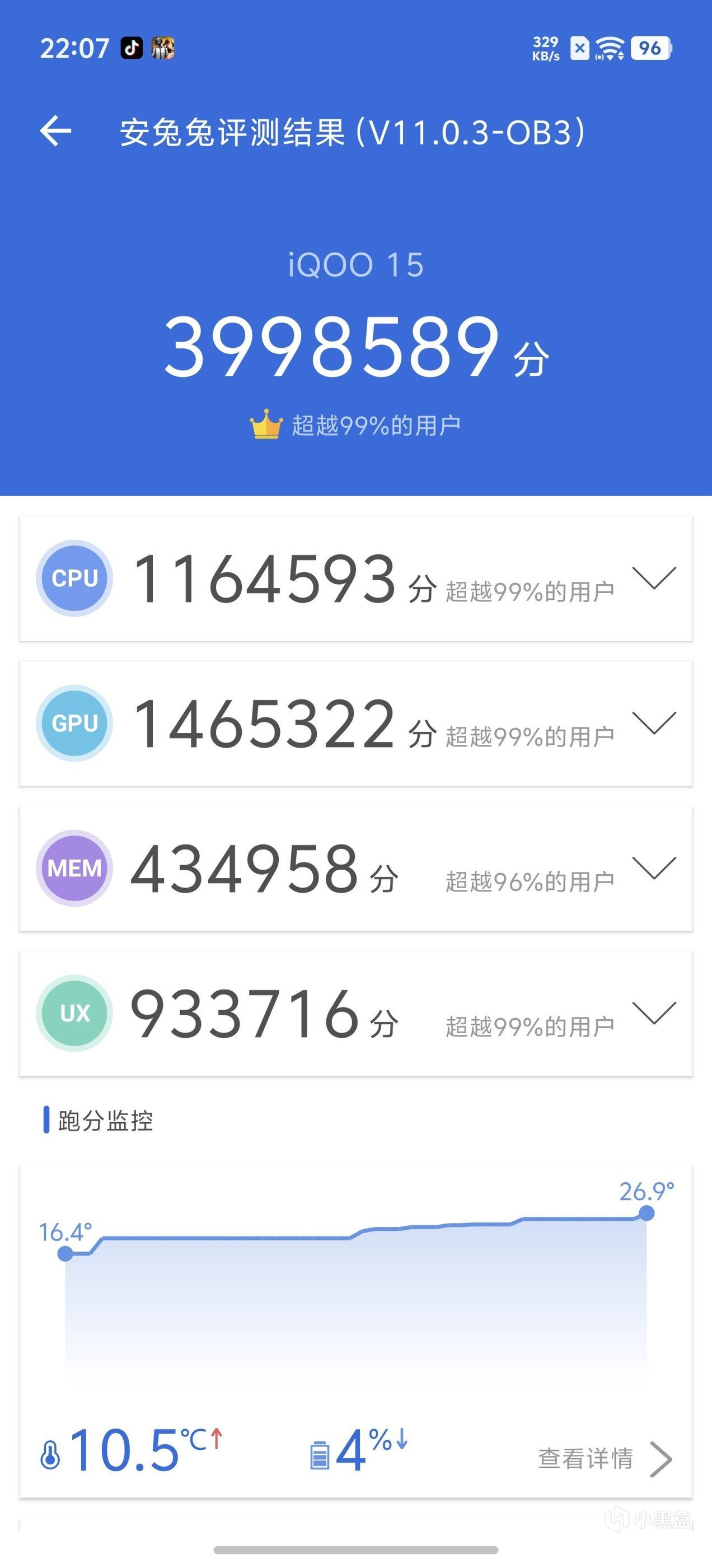 夸张的散热就能应对更从容的调度和更少的降频,同样是8Gen5,即使在没外接散热开启Monster+模式的情况下,跑分依旧逼近400万,且手指接触部分温度均不到40摄氏度。(官方发布会用1T版跑分高达438万,主要来源于储存优势)