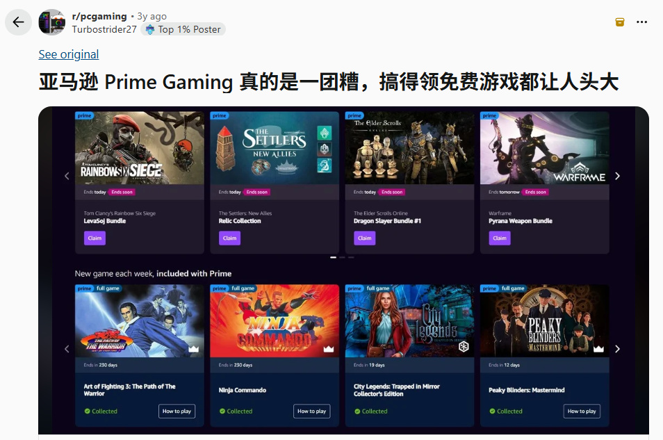 至於Prime Gaming服務,則是免費送遊戲都被玩家嫌棄難用: