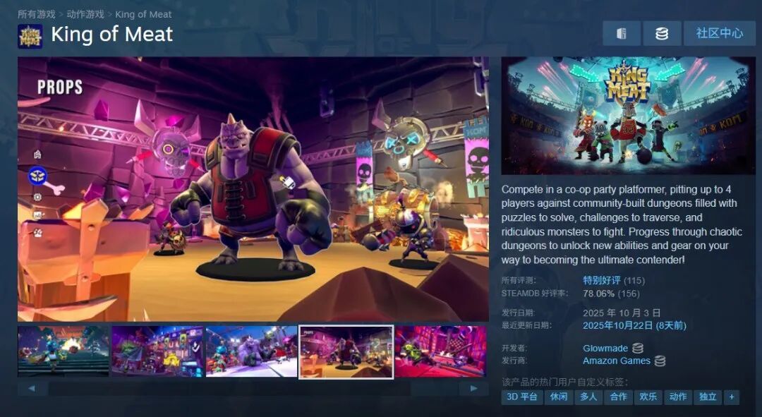 如果把目光放到發行層面,亞馬遜遊戲的表現同樣糟糕:2024年,NCSoft旗下的 MMORPG《天堂永恆》由亞馬遜遊戲負責歐美地區發行,最終宣告失敗;10月初,四人合作平臺跳躍遊戲《King of Meat》登陸Steam,表現堪稱慘淡。