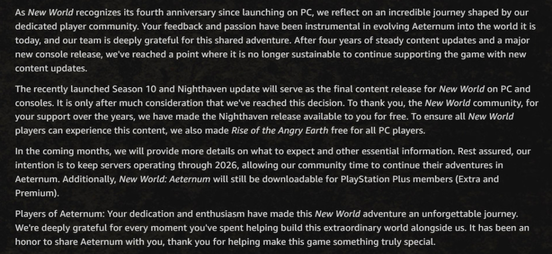 這三個遊戲中,《Breakaway》因爲公測表現過爛,還沒正式上線便被腰斬;《Crucible》在2020年上線5個月後匆匆下架,留下一地雞毛;表現最好的《New World》,也伴隨着本次裁員宣佈了將在明年停止運營。