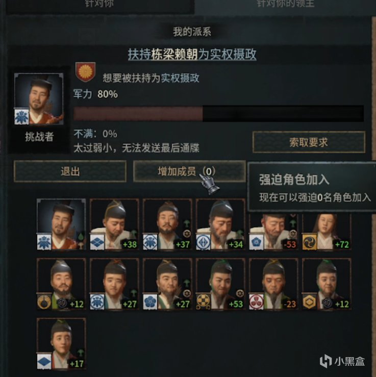 之后你需要威望等级,和公爵头衔去拿集团领导权,你打开领导界面他不愿意的的话,你可以稍微走一下谋略左线,拿一个可以做牵制的技能。