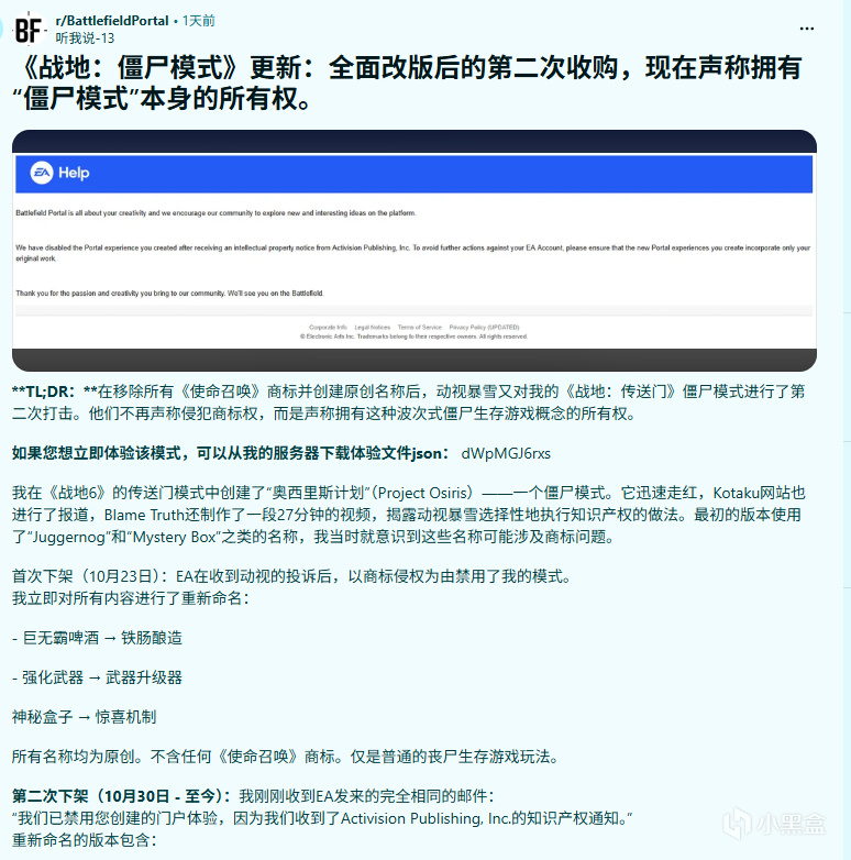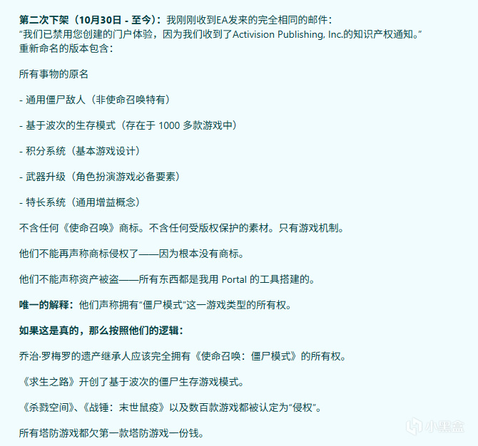 事情起于玩家用 Portal 快速还原经典地图与玩法:有人在上线初期就制作了类似 COD 的近战小图与僵尸波次模式,社区传播带来大量关注,但也同时触发了 EA/Activision 的版权与商标警告。EA 给出过删除或更改的要求,并在邮件中提示若再次违反可能面临封号等惩罚。对创作自由与游戏平台管理边界的争论也随之升温。
