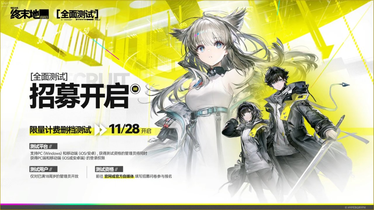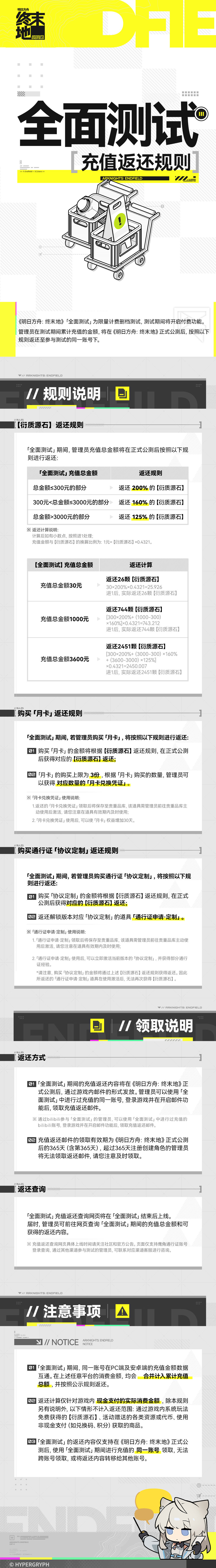 《明日方舟:終末地》「全面測試」爲限量計費刪檔測試,測試期間將開啓付費功能。管理員在測試期間累計充值的金額,將在《明日方舟:終末地》正式公測後,按照以下規則返還。