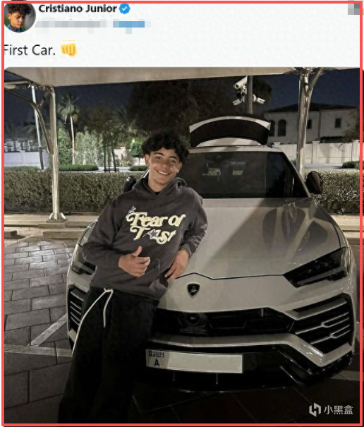 15 岁的迷你罗最近在社交平台上晒出了一张和兰博基尼 Urus 的合影,配文直接写着 “我的第一辆车”。