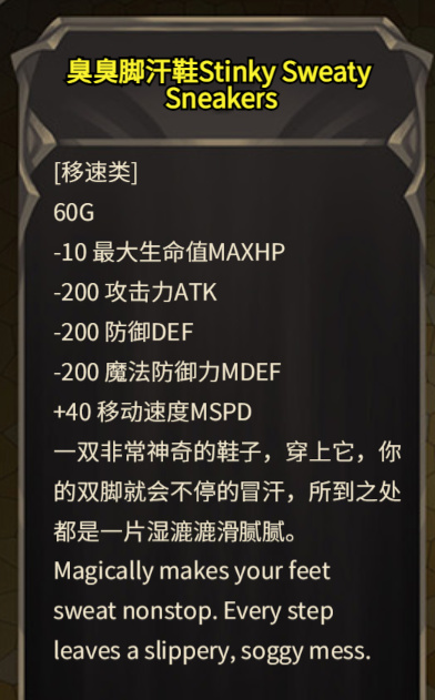 養成很基礎,但裝備介紹很不基礎。臭臭汗腳鞋,穿上它會不停冒汗,減生命值攻擊力防禦法抗但加移速。
