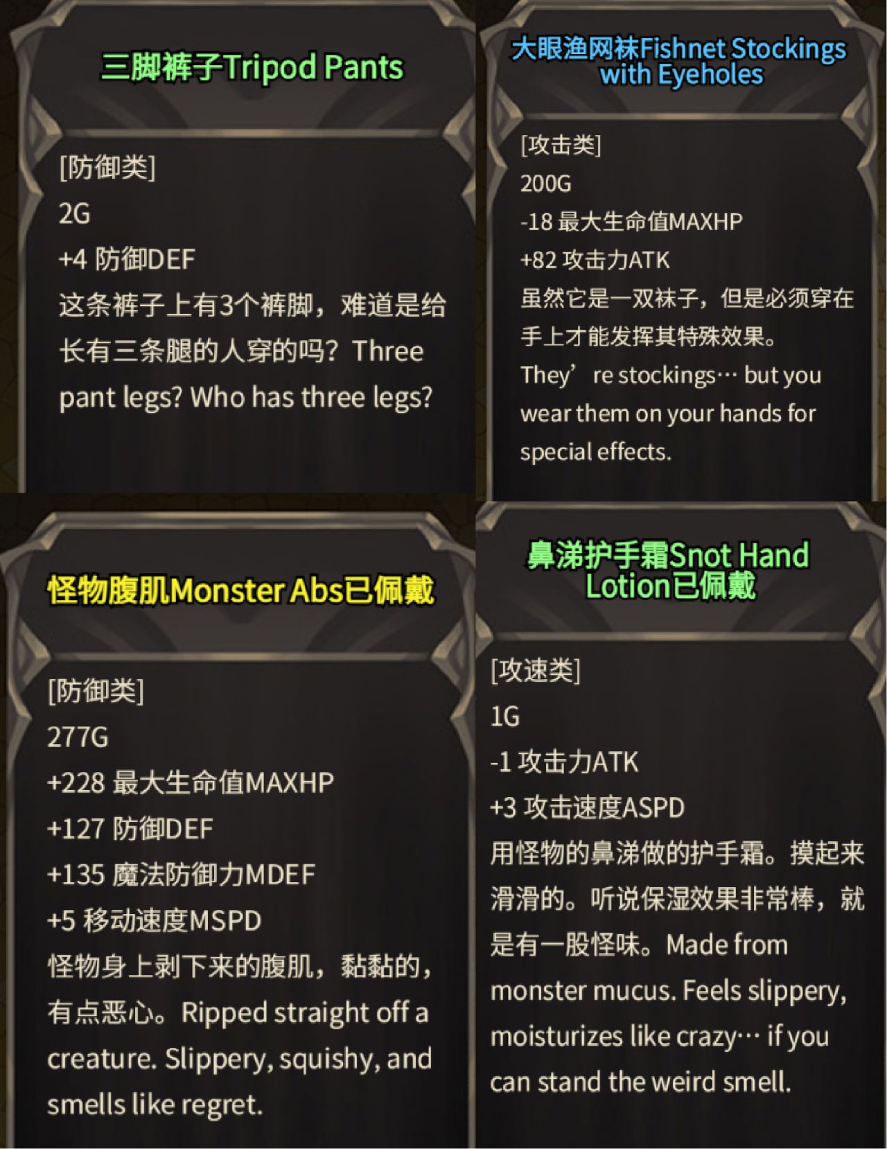 有三個褲腳的褲子,必須穿在手上的大眼漁網襪(不會後面還有套在頭上的內褲吧!),來自怪物的腹肌,加攻速的鼻涕護手霜。