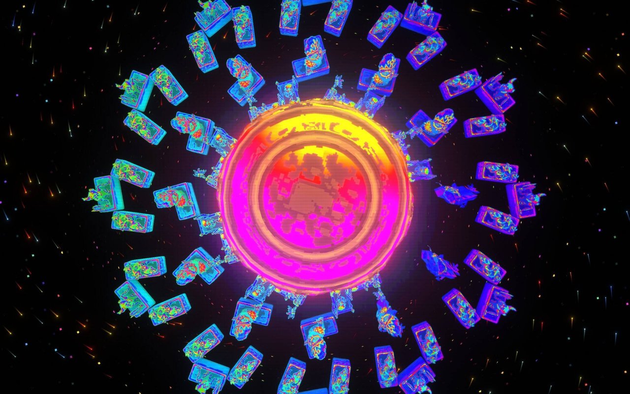 直到鑽進去8人後,他們攜手,帶着「只要出現飛船就有的彩虹色光污染」從深淵底部飛了出來,之前的外星飛船,或者說是“月亮”變成了巴別塔城池的樣子,衆人一起升空。