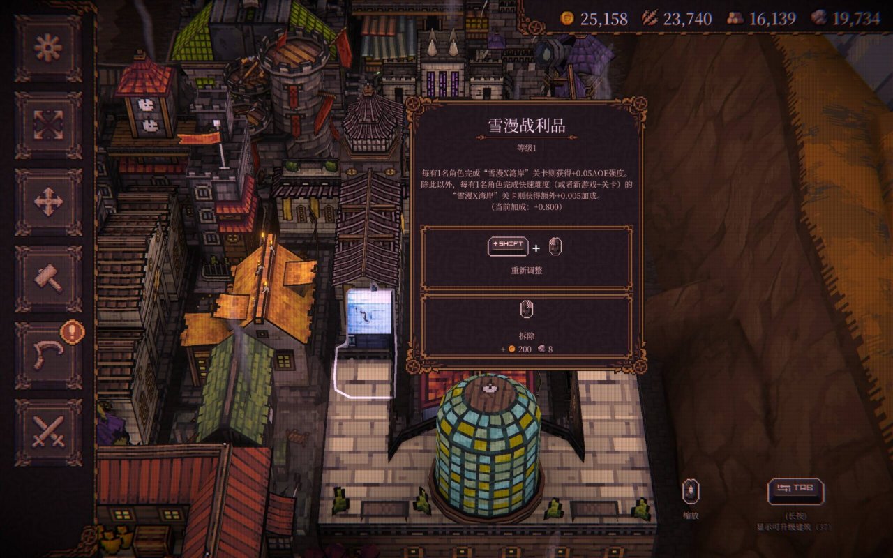 此外,每張地圖首次通關後,會解鎖一個1x1建築,效果是“本圖使用不同角色通關越多,局外戰力越強”。