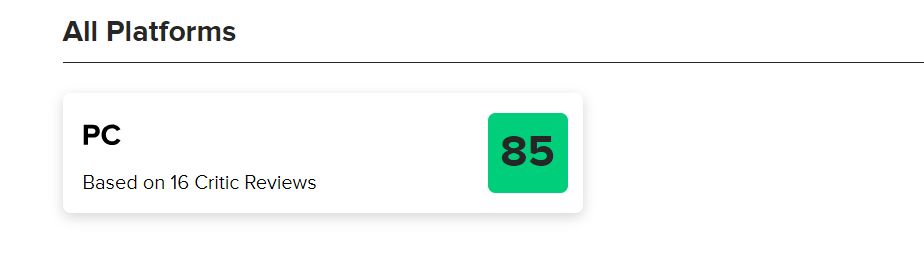 Metacritic(PC端收录16家媒体评分,Metascore85分)