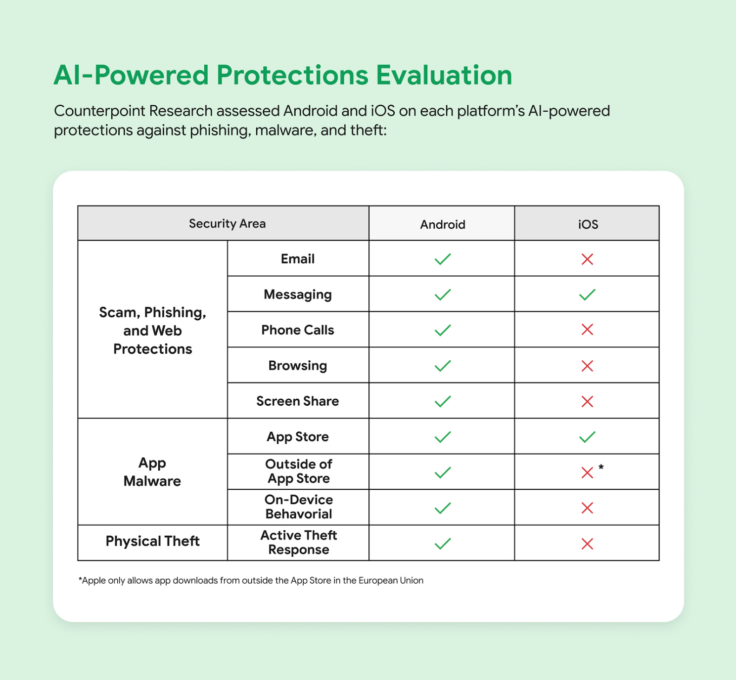 谷歌引用独立研究机构的评估称,Android在包括通话筛查、短信检测与实时风险提示等十项保护类别中具备更全面的 AI 驱动能力。