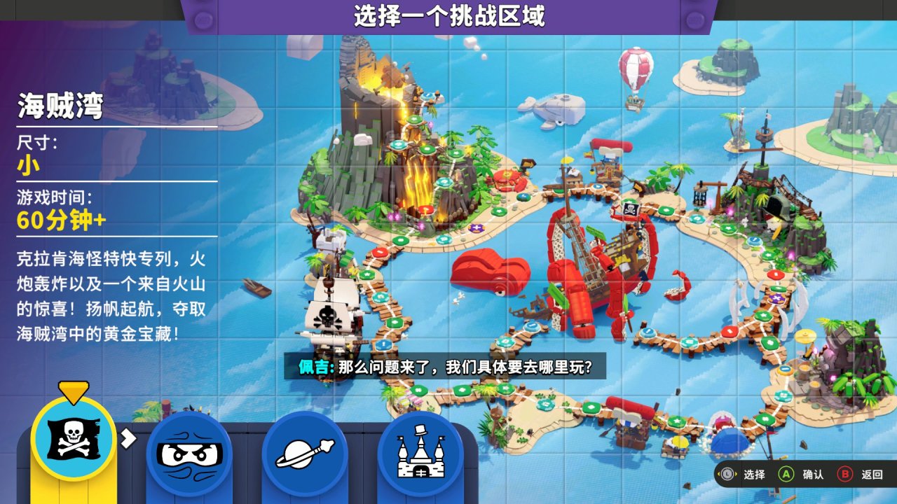 模式提供了四个十分丰富的乐高王国,让玩家在其中掷骰冒险,经历随机事件,并于有限的回合内达到胜利条件:拿到最多的金砖。