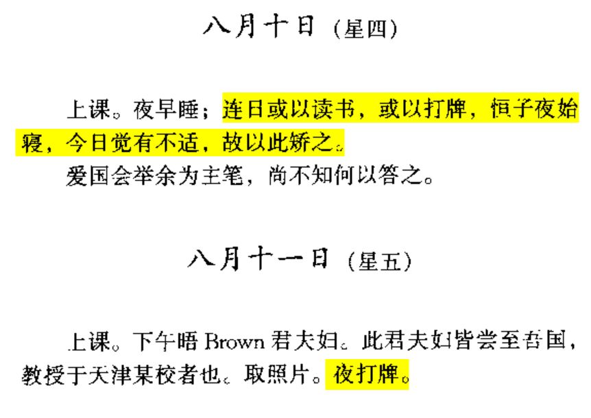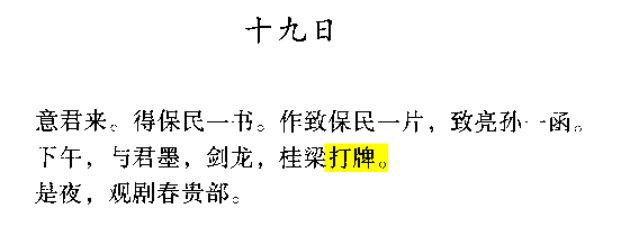 不过网上流传的胡适日记也算不上完全凭空杜撰,因为胡适确有打牌的爱好。最早关于打牌的记录在己酉十二月十九日(即1910年1月29日):“下午,与君墨,剑龙,桂梁打牌。”