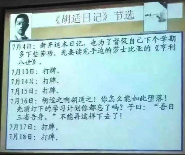 如果没看漏的话,在我所看的日记中,胡适一共打了49次牌,其中确实有“无事。打牌。”或"上课。打牌。"这样的表述。