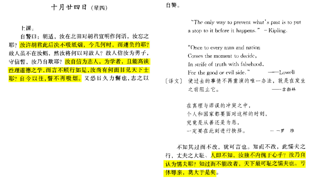 在日记中,胡适提了三次要戒烟,其中第三次能看出他彻底红温了,不知道后面有没有成功。