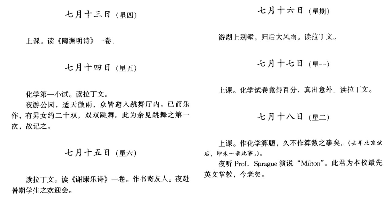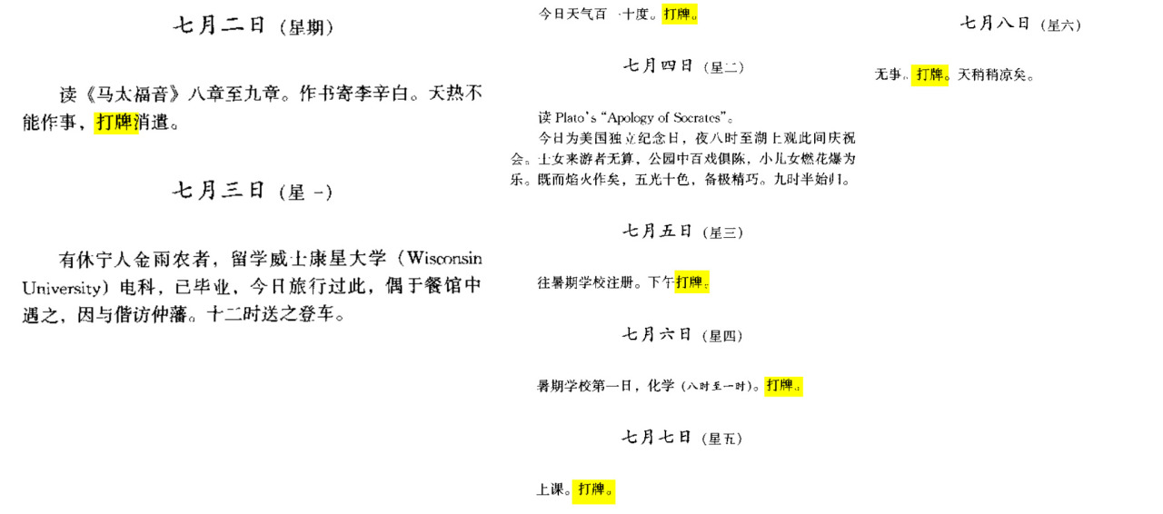 时间上和网传片段最符合应该是1911年7月份,胡适在康奈尔大学农学院期间,以下是当时那几天的日记内容。显然并没有沉迷打牌。