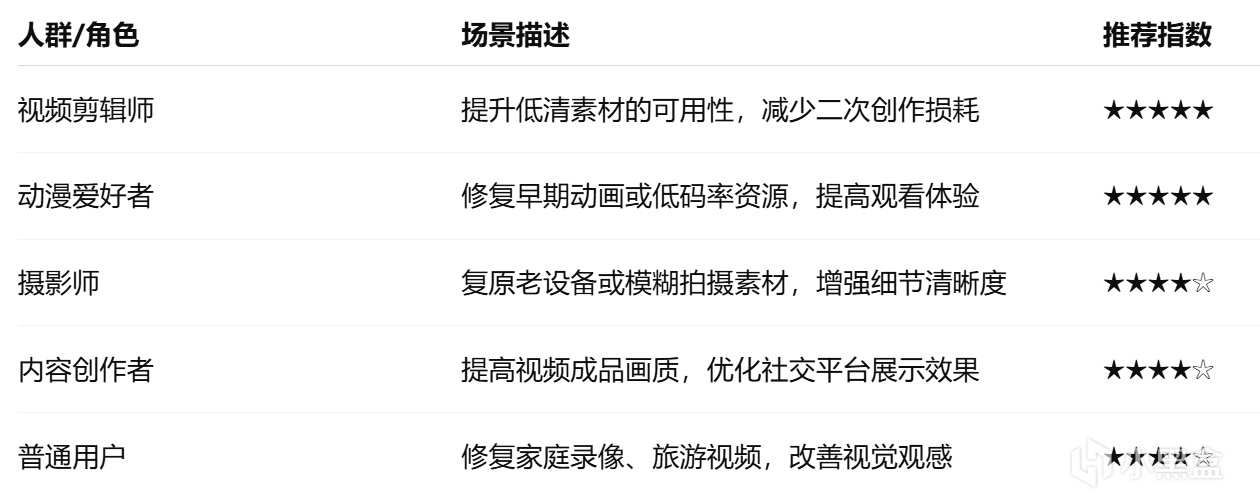 Video2X 的使用场景覆盖了视频修复、二次创作、内容再利用等多个领域。以下表格展示了不同人群的典型应用与推荐程度: