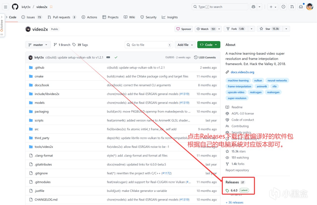 Video2X 的上手过程非常简单,即使没有技术背景,也能在几分钟内完成视频修复,软件获取方法,打开GitHub,搜索项目名【video2x】进入到项目页面,点击Releases下载软件包,